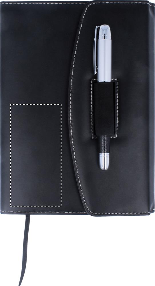 DIN A5 Portfolio aus PU. Block mit 120 Blatt (240 Seiten) liniertem Papier und farblich passendem Metallkugelschreiber. Schwarze Tinte.